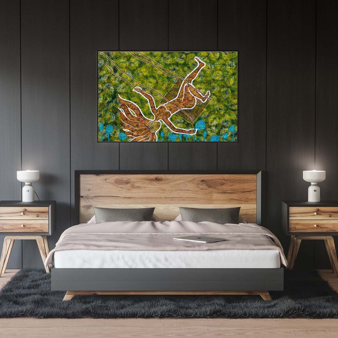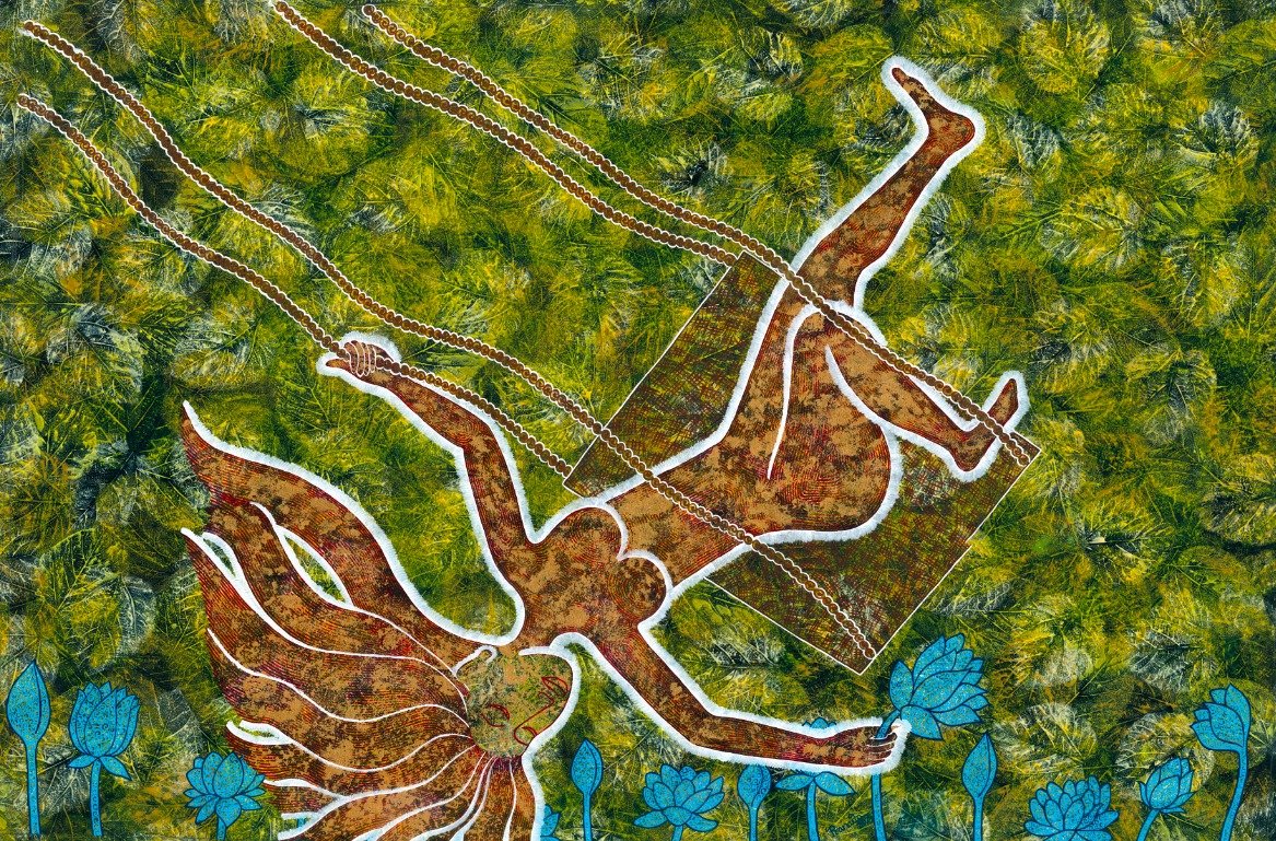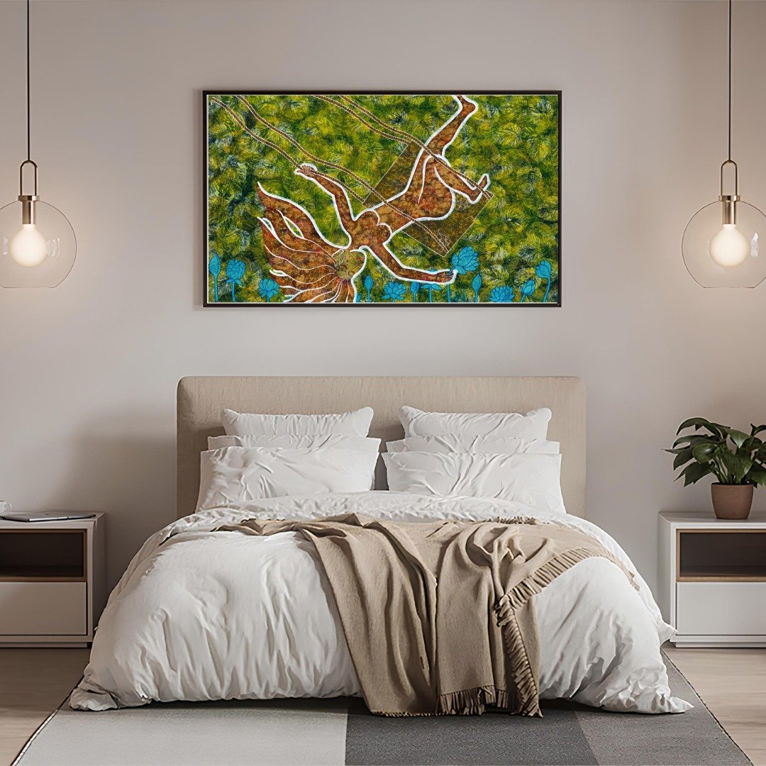 This painting portrays the simplicity and beauty of life. Swinging symbolizes joy and freedom, while plucking the lotus shows that the woman seeks and cherishes precious and significant things in her journey. This artwork symbolizes freedom and creativity in a woman’s life journey.